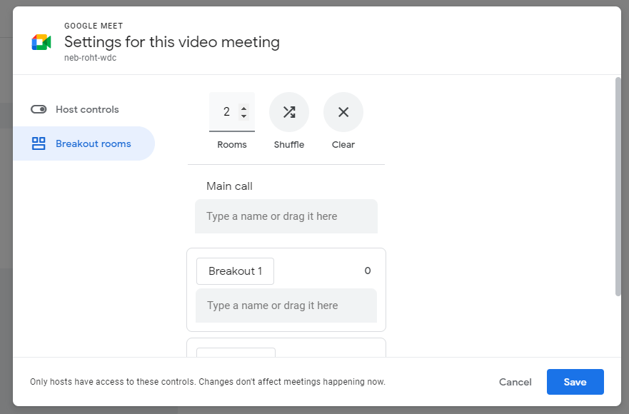 When adding a Google Meet Video Call to a Google Calendar Event, you can set up your Breakout Rooms ahead of time. To do this: