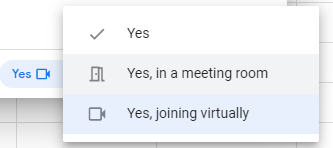 in the menu at the bottom of your Meeting. Choose Change Background, and then select your options - Virtual or In-Person – When meeting with others in a Google Meet that you have scheduled in Google Calendar, attendees now have the option of letting you know if they plan to meet in person on virtually. This requires that you add a Google Meet Video Conference, and a Room to your meeting. Once you do that and invite others to the meeting they will see a drop-down option in the Yes response allowing them to choose.