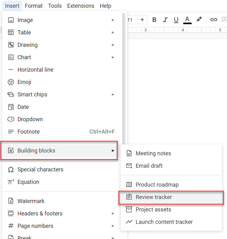 To use Review Tracker, open Google Docs (http://docs.new) and click Insert > building Blocks > Review Tracker